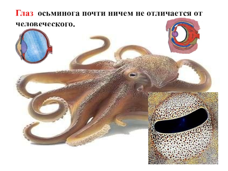 Имеется голова - на ней расположены органы чувств.Глаз осьминога почти ничем не отличается от человеческого.