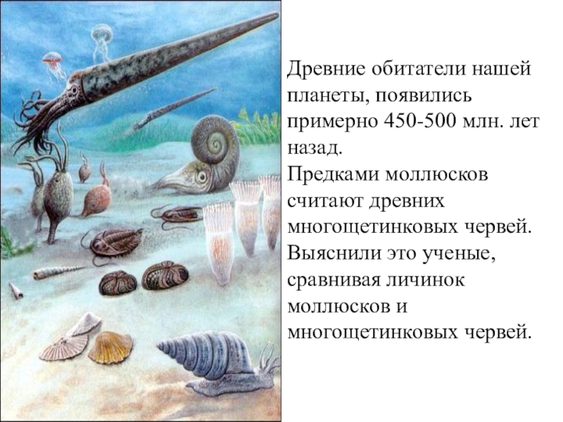 Древние обитатели нашей планеты, появились примерно 450-500 млн. лет назад. Предками моллюсков считают древних многощетинковых червей. Выяснили