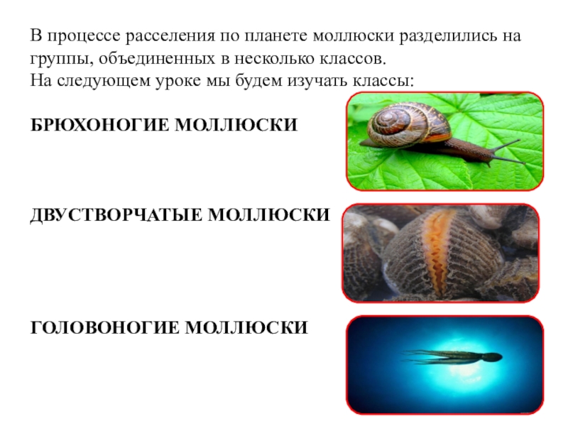 В процессе расселения по планете моллюски разделились на группы, объединенных в несколько классов.На следующем уроке мы будем