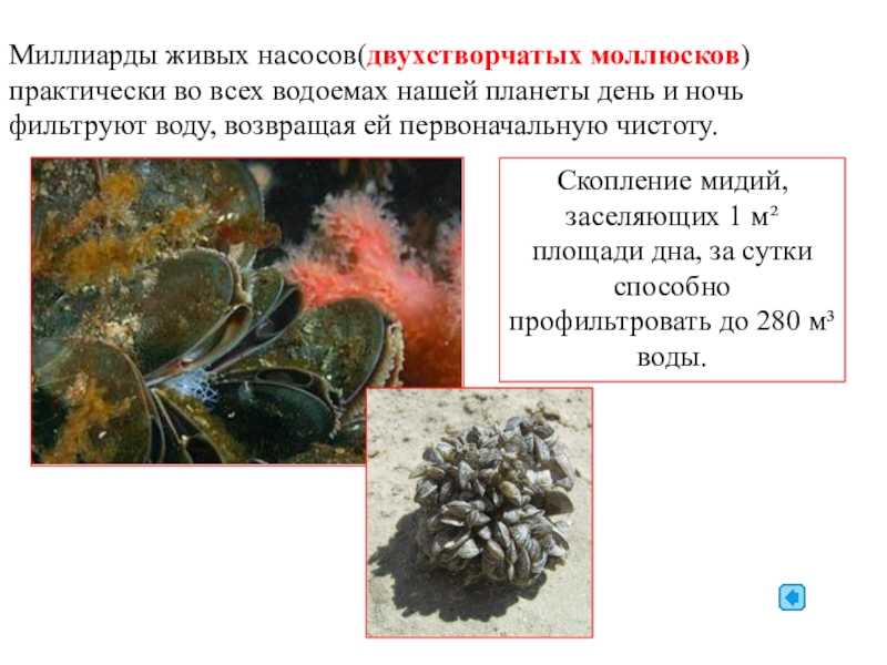 Миллиарды живых насосов(двухстворчатых моллюсков) практически во всех водоемах нашей планеты день и ночь фильтруют воду, возвращая ей первоначальную чистоту.