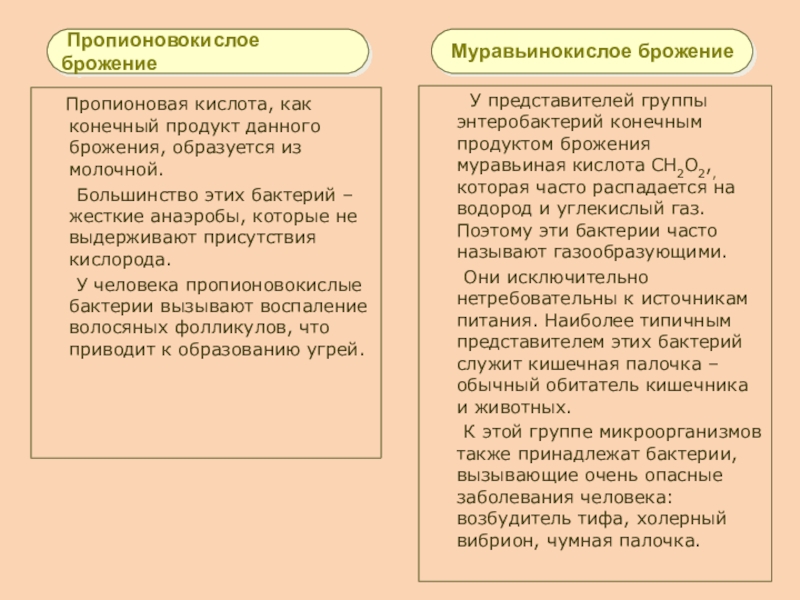 У представителей группы энтеробактерий конечным продуктом брожения муравьиная кислота СН2О2,, которая часто распадается на водород и углекислый газ. Поэтому эти бактерии часто называют газообразующими.