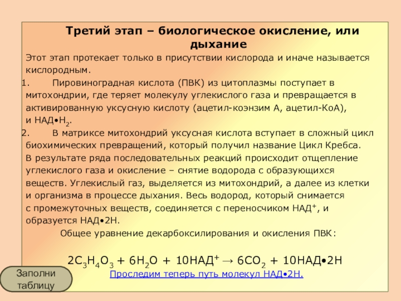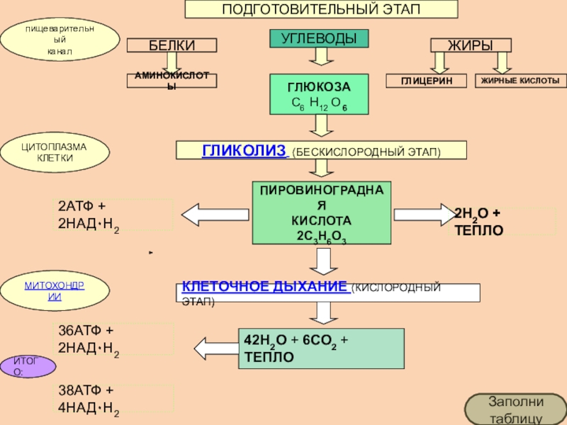 С6Н12О6+ 2АДФ + 2Н3РО4 + 2НАД+ 2С3Н4О3 + 2НАД۰ Н2 + 2АТФ + 2Н2О + ТЕПЛО