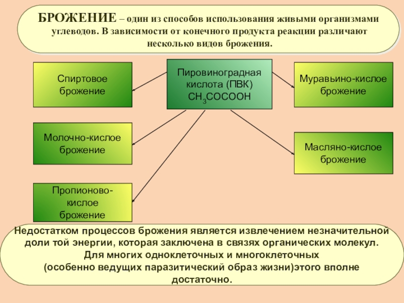 Этот процесс так же называется брожением. Термин «брожение» обычно применяют по отношению к процессам, протекающим в клетках микроорганизмов или растений.