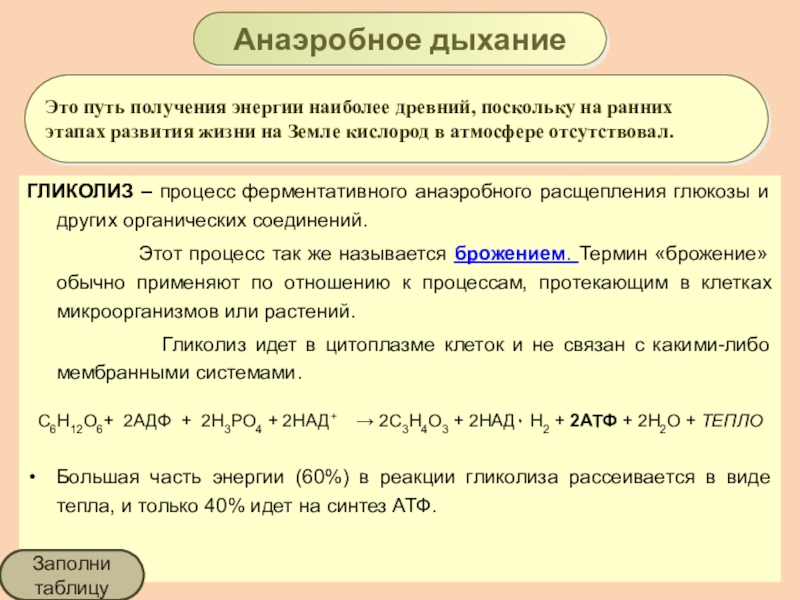 ГЛИКОЛИЗ – процесс ферментативного анаэробного расщепления глюкозы и других органических соединений.