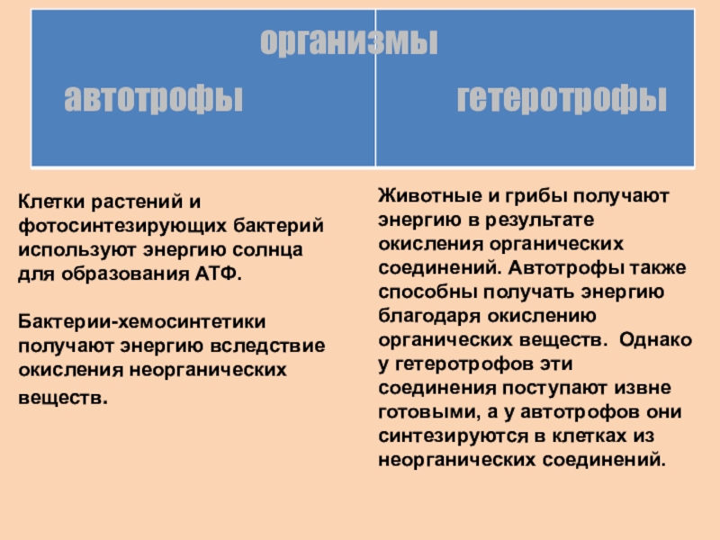 Животные и грибы получают энергию в результате окисления органических соединений. Автотрофы также способны получать энергию благодаря окислению органических веществ. Однако у гетеротрофов эти соединения поступают извне готовыми, а у автотрофов они синтезируются в клетках из неорганических соединений.