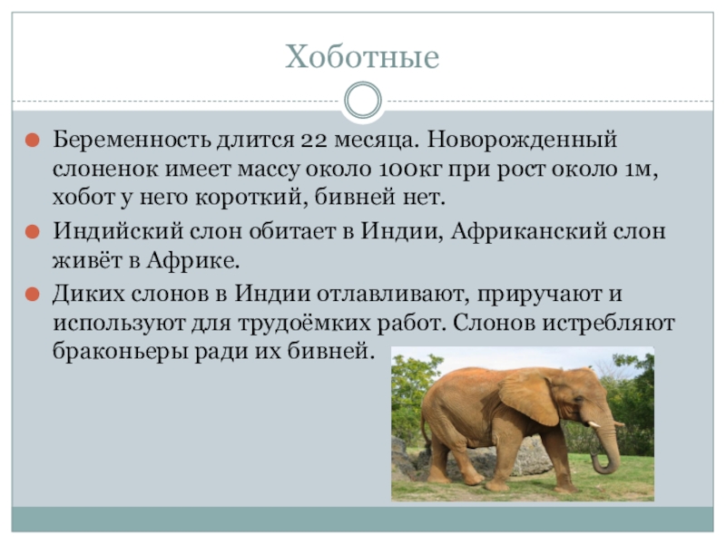 Беременность длится 22 месяца. Новорожденный слоненок имеет массу около 100кг при