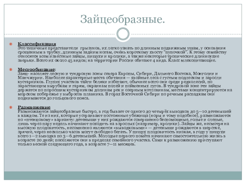 у основания срощенным в трубку, длинным задним ногам, очень короткому хвосту "пупочкой". К этому семейству относятся всем известные зайцы, пищухи и кролики, а также некоторые тропические длинноухие зверьки. Всего их около 45 видов; на территории России обитают 4 вида. Класс млекопитающие.