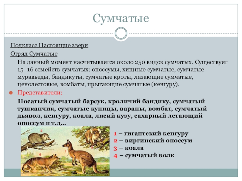 250 видов сумчатых. Существует 15–16 семейств сумчатых: опоссумы, хищные сумчатые, сумчатые муравьеды, бандикуты, сумчатые кроты, лазающие сумчатые, ценолестовые, вомбаты, прыгающие сумчатые (кенгуру).