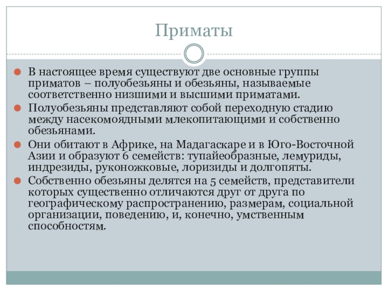 В настоящее время существуют две основные группы приматов – полуобезьяны и