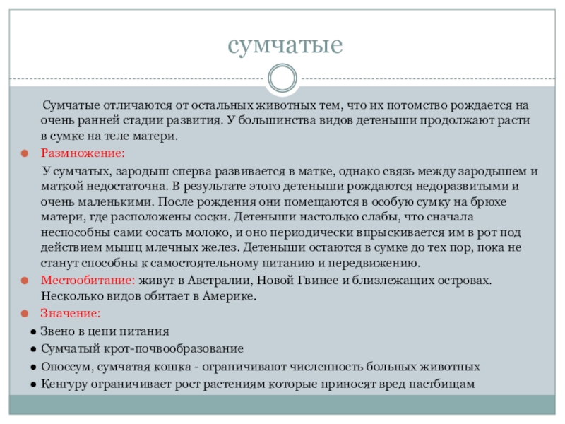 У сумчатых, зародыш сперва развивается в матке, однако связь между зародышем и маткой недостаточна. В результате этого детеныши рождаются недоразвитыми и очень маленькими. После рождения они помещаются в особую сумку на брюхе матери, где расположены соски. Детеныши настолько слабы, что сначала неспособны сами сосать молоко, и оно периодически впрыскивается им в рот под действием мышц млечных желез. Детеныши остаются в сумке до тех пор, пока не станут способны к самостоятельному питанию и передвижению.