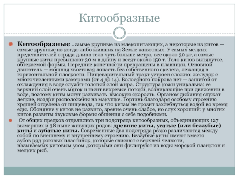 От общих предков отделились три подотряда китообразных, объединяющих 127 вымерших и 38 ныне живущих родов: древние киты, усатые (или беззубые) киты и зубатые киты. Современные два подотряда резко различаются между собой по внешнему и внутреннему строению. Беззубые киты имеют вместо зубов ряд роговых пластинок, которые свисают с верхней челюсти, называемых китовым усом ,которыми они фильтруют из воды морской планктон и мелких рыб.