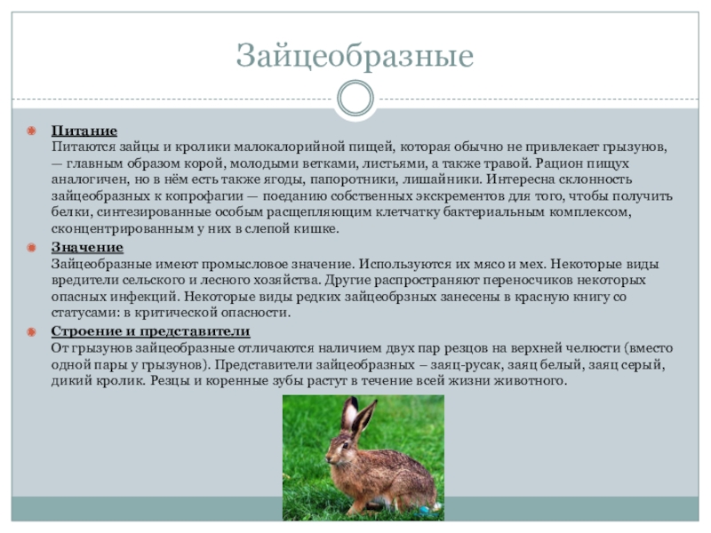 От грызунов зайцеобразные отличаются наличием двух пар резцов на верхней челюсти (вместо одной пары у грызунов). Представители зайцеобразных – заяц-русак, заяц белый, заяц серый, дикий кролик. Резцы и коренные зубы растут в течение всей жизни животного.