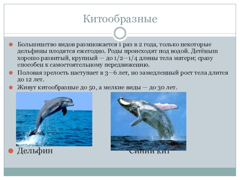 Большинство видов размножается 1 раз в 2 года, только некоторые дельфины