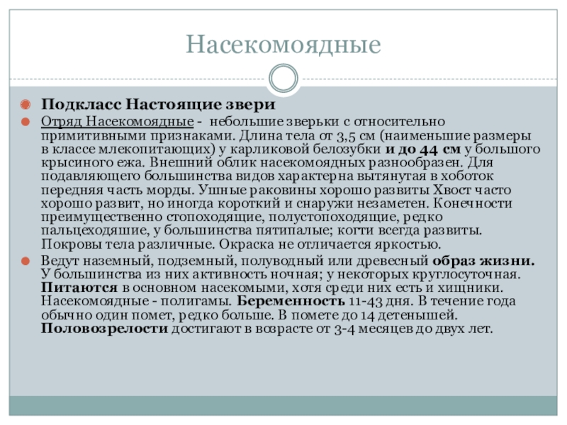 Отряд Насекомоядные - небольшие зверьки с относительно примитивными признаками.