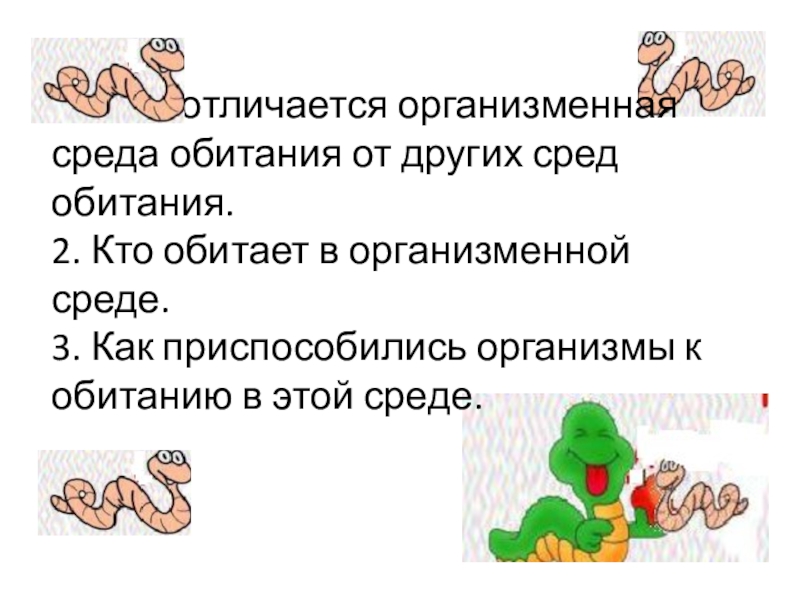 Слайд 41. Чем отличается организменная среда обитания от других сред обитания. 2. Кто