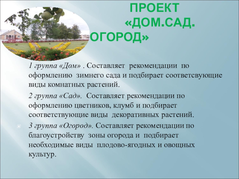 1 группа «Дом» . Составляет рекомендации по оформлению зимнего сада и подбирает соответсвующие виды комнатных растений.