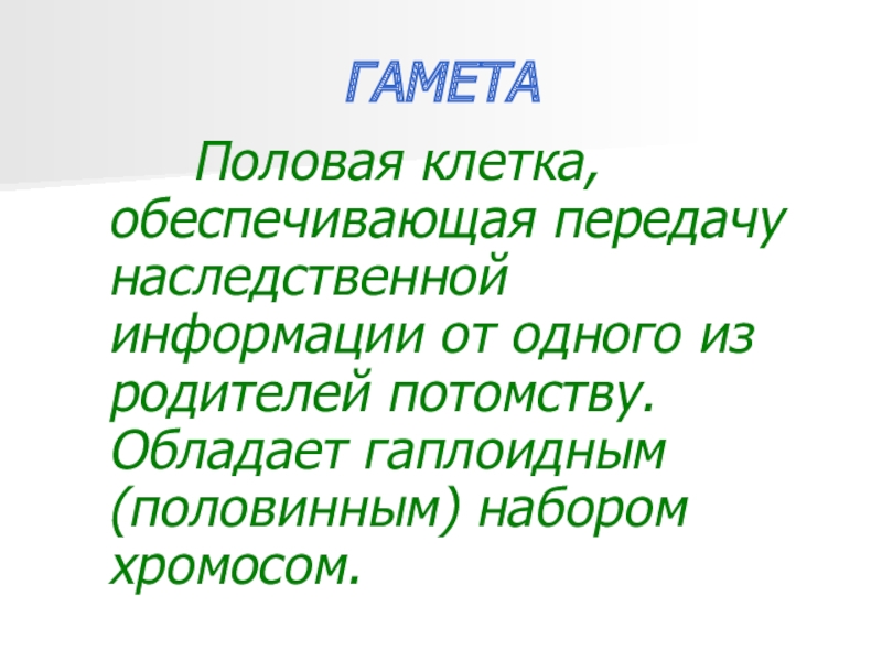 одного из родителей потомству. Обладает гаплоидным (половинным) набором хромосом.