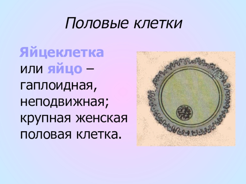 Яйцеклетка или яйцо – гаплоидная, неподвижная; крупная женская половая