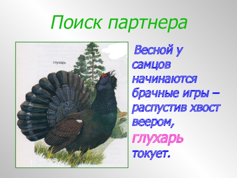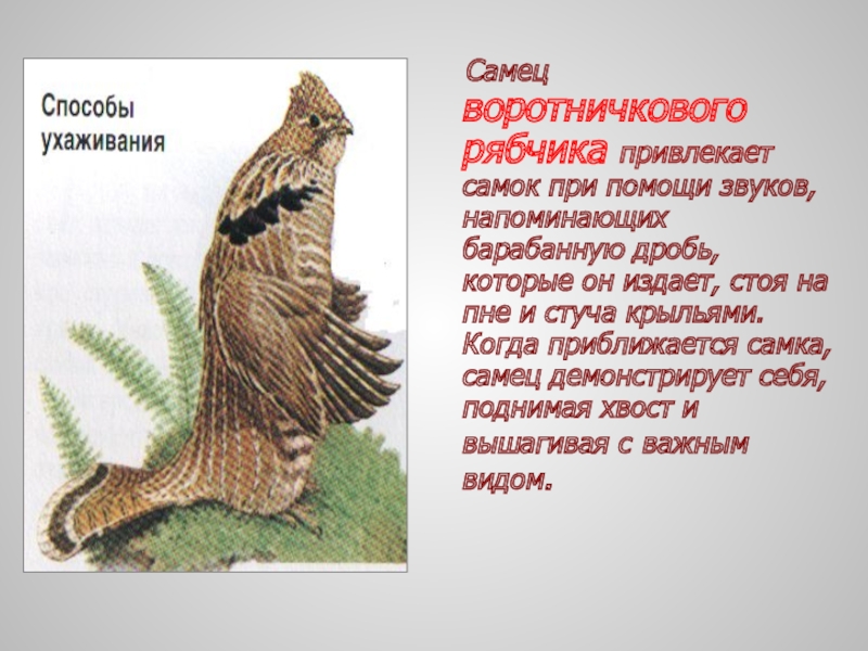 барабанную дробь, которые он издает, стоя на пне и стуча крыльями. Когда приближается самка, самец демонстрирует себя, поднимая хвост и вышагивая с важным видом.