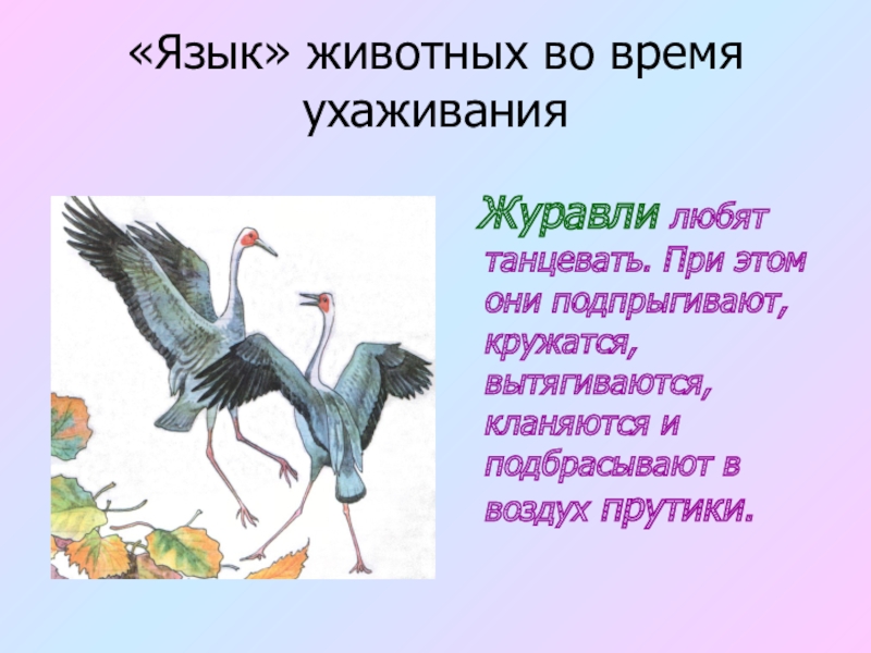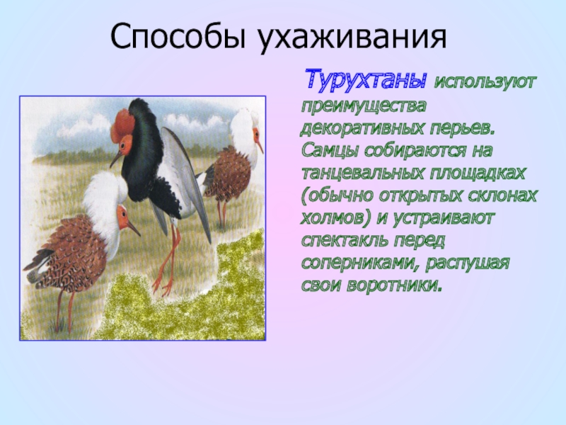 танцевальных площадках(обычно открытых склонах холмов) и устраивают спектакль перед соперниками, распушая свои воротники.