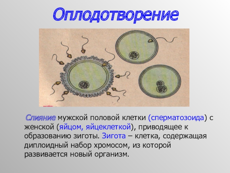 приводящее к образованию зиготы. Зигота – клетка, содержащая диплоидный набор хромосом, из которой развивается новый организм.