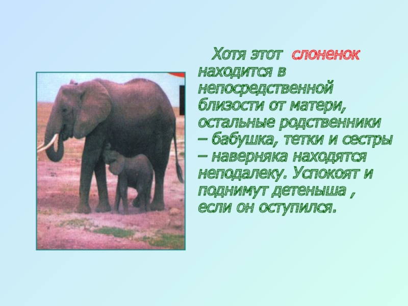 от матери, остальные родственники – бабушка, тетки и сестры – наверняка находятся неподалеку. Успокоят и поднимут детеныша , если он оступился.