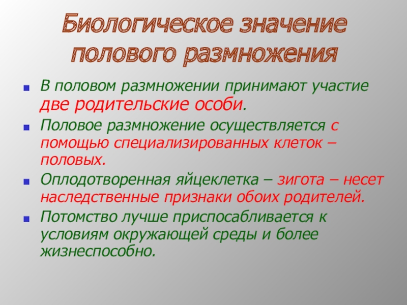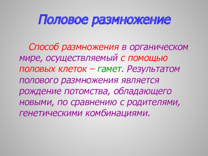 осуществляемый с помощью половых клеток – гамет. Результатом полового размножения является рождение потомства, обладающего новыми, по сравнению с родителями, генетическими комбинациями.