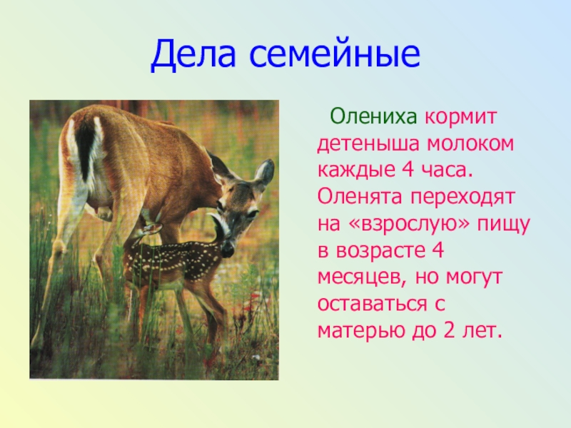 Оленята переходят на «взрослую» пищу в возрасте 4 месяцев, но могут оставаться с матерью до 2 лет.