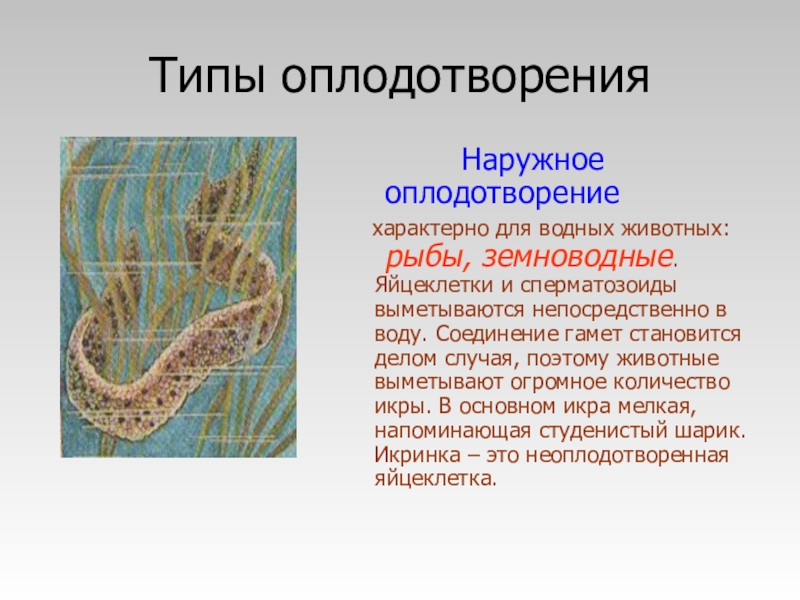 характерно для водных животных: рыбы, земноводные. Яйцеклетки и сперматозоиды выметываются непосредственно в воду. Соединение гамет становится делом случая, поэтому животные выметывают огромное количество икры. В основном икра мелкая, напоминающая студенистый шарик. Икринка – это неоплодотворенная яйцеклетка.