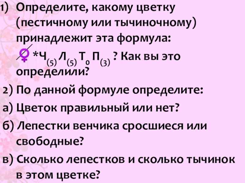Слайд 1Определите, какому цветку (пестичному или тычиночному) принадлежит эта формула: