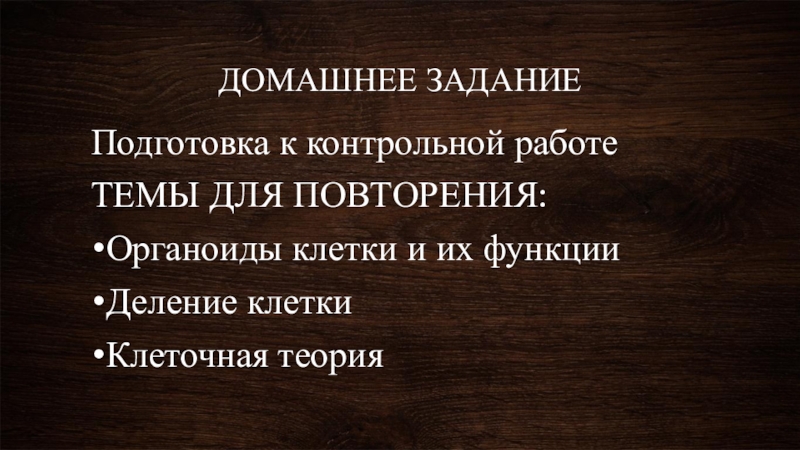 ДОМАШНЕЕ ЗАДАНИЕПодготовка к контрольной работеТЕМЫ ДЛЯ ПОВТОРЕНИЯ: Органоиды клетки и их функцииДеление клеткиКлеточная теория