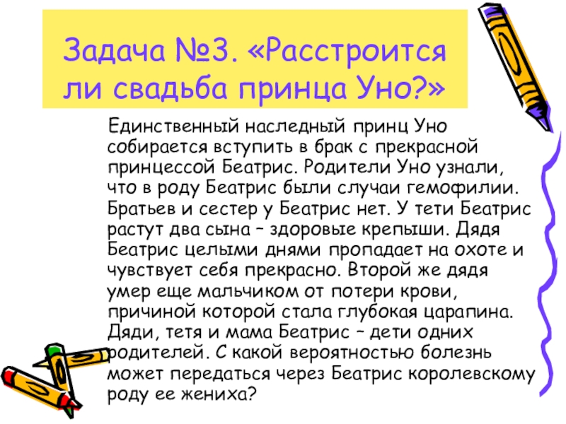 Слайд 6Задача №3. «Расстроится ли свадьба принца Уно?»