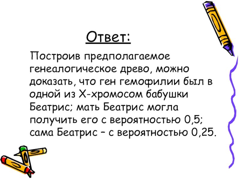 был в одной из X-хромосом бабушки Беатрис; мать Беатрис могла получить его с вероятностью 0,5; сама Беатрис – с вероятностью 0,25.