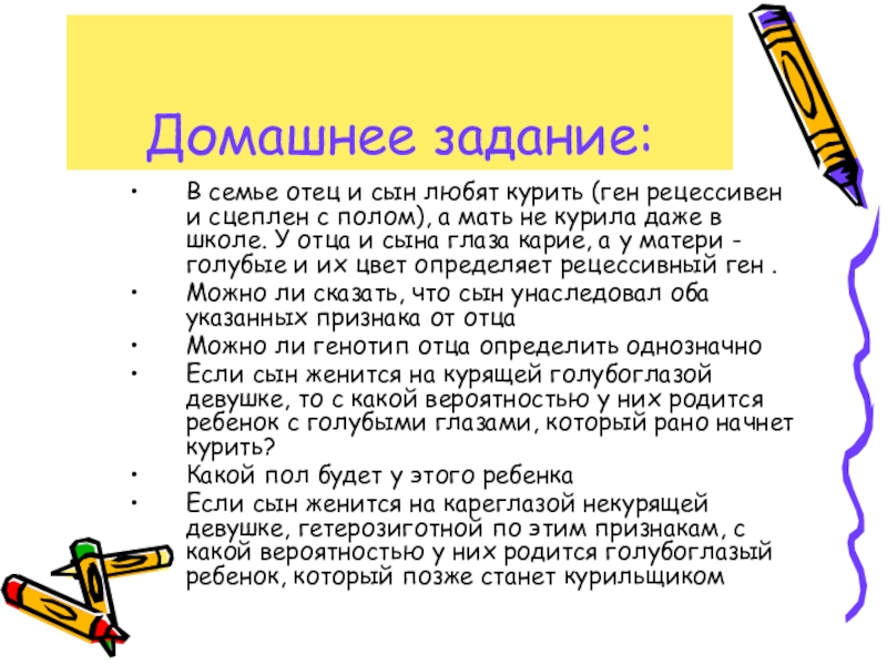 сцеплен с полом), а мать не курила даже в школе. У отца и сына глаза карие, а у матери - голубые и их цвет определяет рецессивный ген .