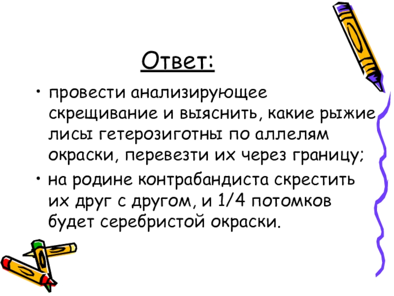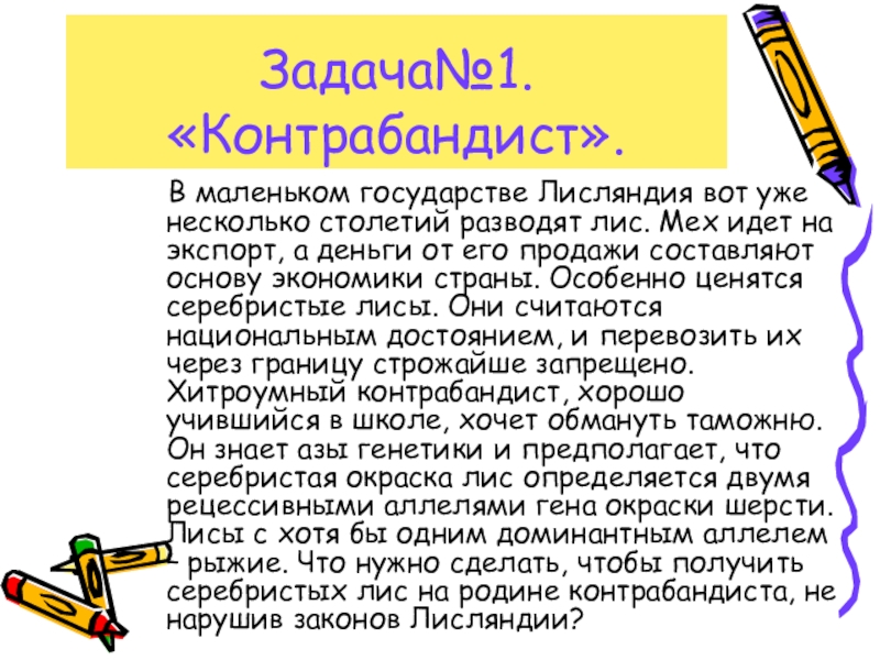разводят лис. Мех идет на экспорт, а деньги от его продажи составляют основу экономики страны. Особенно ценятся серебристые лисы. Они считаются национальным достоянием, и перевозить их через границу строжайше запрещено. Хитроумный контрабандист, хорошо учившийся в школе, хочет обмануть таможню. Он знает азы генетики и предполагает, что серебристая окраска лис определяется двумя рецессивными аллелями гена окраски шерсти. Лисы с хотя бы одним доминантным аллелем – рыжие. Что нужно сделать, чтобы получить серебристых лис на родине контрабандиста, не нарушив законов Лисляндии?