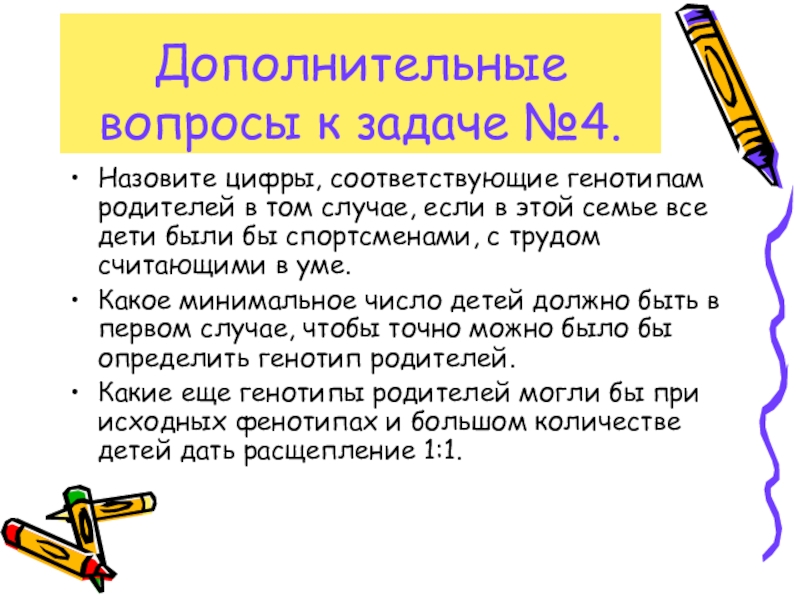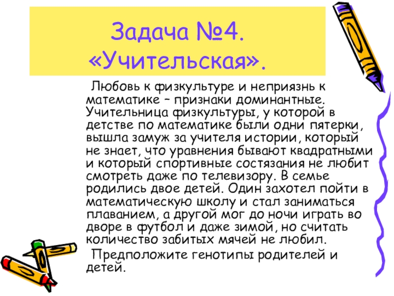 к математике – признаки доминантные. Учительница физкультуры, у которой в детстве по математике были одни пятерки, вышла замуж за учителя истории, который не знает, что уравнения бывают квадратными и который спортивные состязания не любит смотреть даже по телевизору. В семье родились двое детей. Один захотел пойти в математическую школу и стал заниматься плаванием, а другой мог до ночи играть во дворе в футбол и даже зимой, но считать количество забитых мячей не любил.