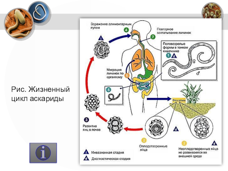 Рис. Паразитический круглый червь токсокара и органы химического распознавания у нематоды