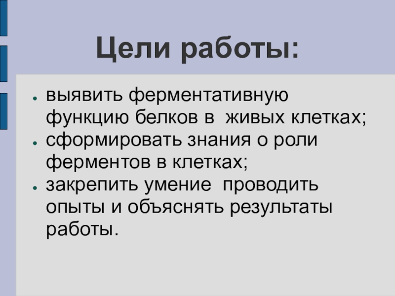 Цели работы:выявить ферментативную функцию белков в живых клетках; сформировать знания о роли ферментов в клетках; закрепить умение