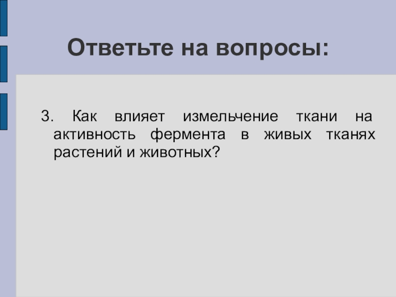 Ответьте на вопросы:3. Как влияет измельчение ткани на активность фермента в живых тканях растений и животных?