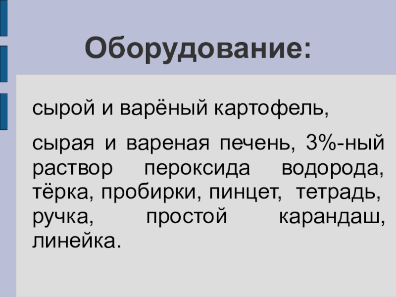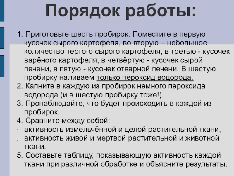 Оборудование:сырой и варёный картофель, сырая и вареная печень, 3%-ный раствор пероксида водорода, тёрка, пробирки, пинцет, тетрадь, ручка,