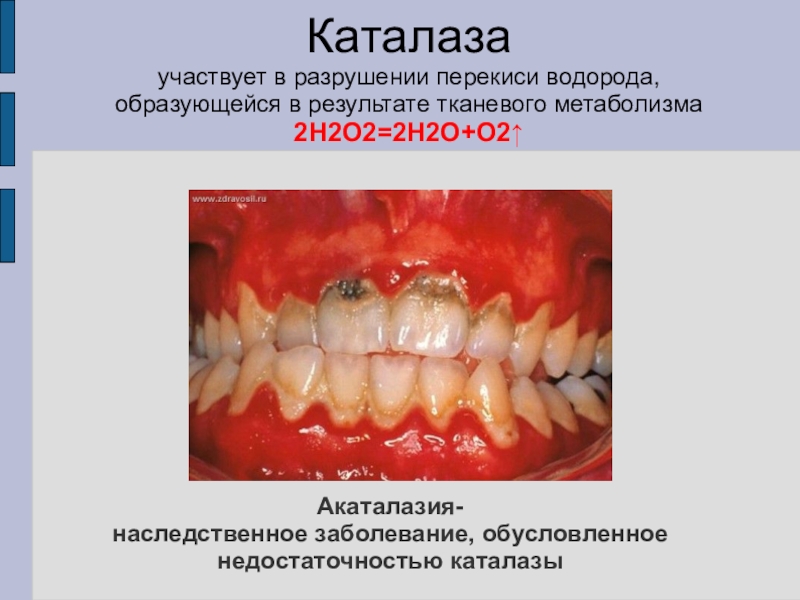 Слайд 6Акаталазия- наследственное заболевание, обусловленное недостаточностью каталазы