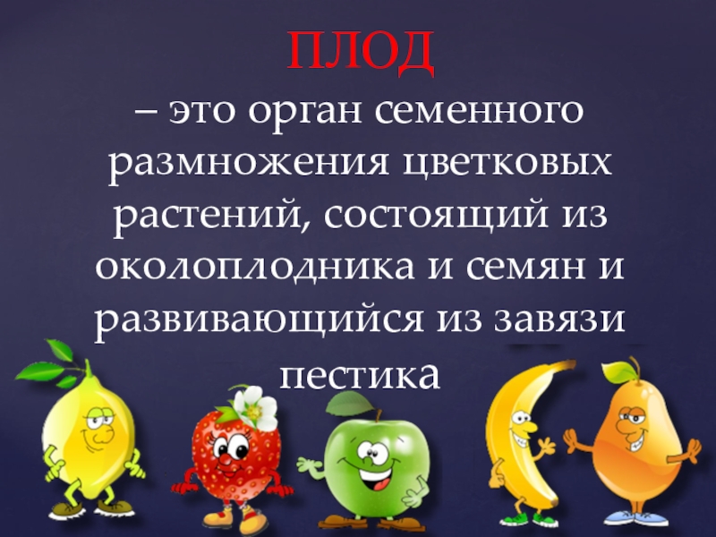 ПЛОД  – это орган семенного размножения цветковых растений, состоящий из околоплодника и семян и развивающийся из