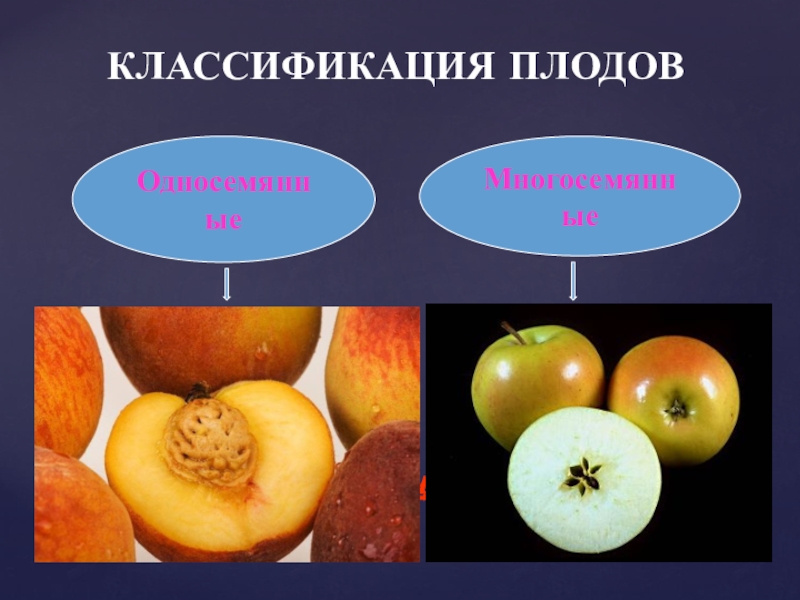 Классификация плодовОдносемянныеМногосемянныеКЛАССИФИКАЦИЯ ПЛОДОВ
