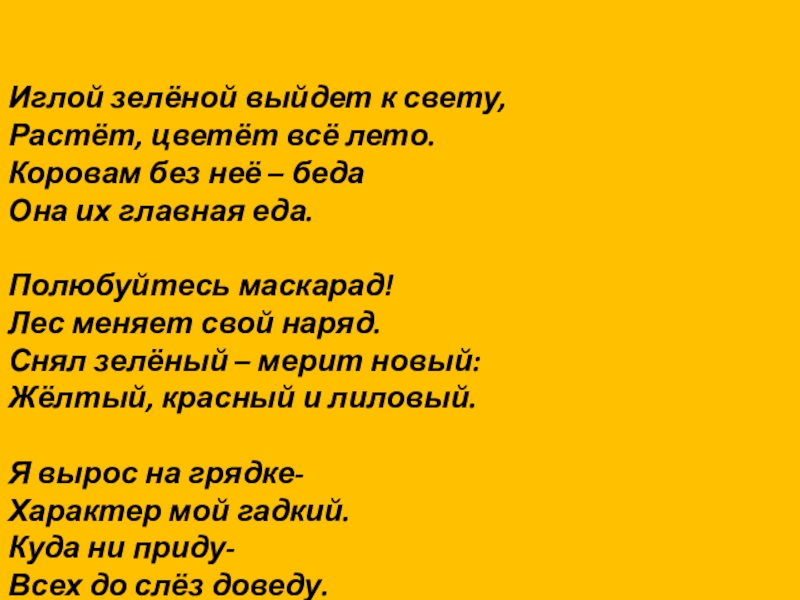Иглой зелёной выйдет к свету,Растёт, цветёт всё лето.Коровам без неё – бедаОна их главная еда. Полюбуйтесь маскарад!Лес