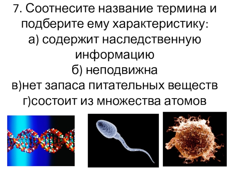 7. Соотнесите название термина и подберите ему характеристику: а) содержит наследственную информацию б) неподвижна в)нет запаса питательных
