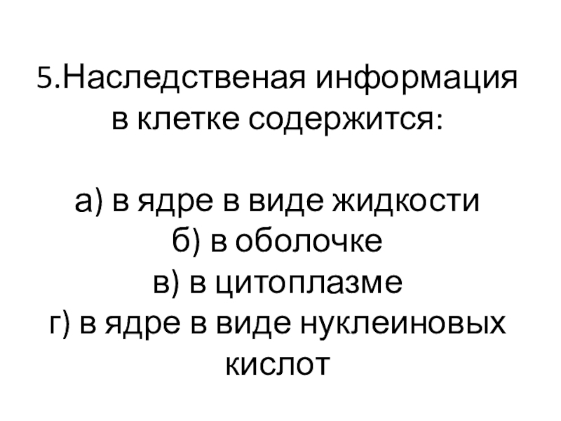 5.Наследственая информация в клетке содержится:  а) в ядре в виде жидкости б) в оболочке в) в