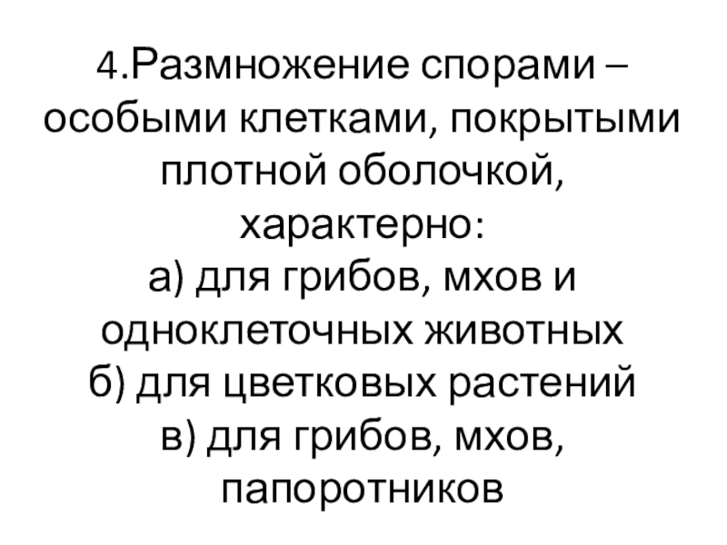 4.Размножение спорами – особыми клетками, покрытыми плотной оболочкой, характерно: а) для грибов, мхов и одноклеточных животных б)