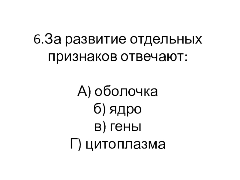 6.За развитие отдельных признаков отвечают:  А) оболочка б) ядро в) гены Г) цитоплазма