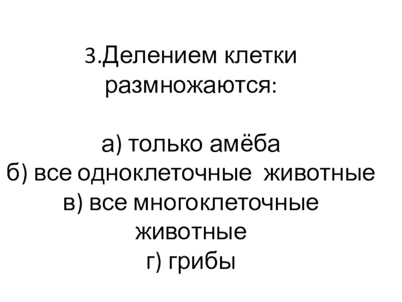 3.Делением клетки размножаются:  а) только амёба б) все одноклеточные животные  в) все многоклеточные животные