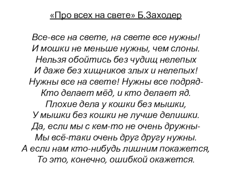 не меньше нужны, чем слоны. Нельзя обойтись без чудищ нелепых И даже без хищников злых и нелепых! Нужны все на свете! Нужны все подряд- Кто делает мёд, и кто делает яд. Плохие дела у кошки без мышки, У мышки без кошки не лучше делишки. Да, если мы с кем-то не очень дружны- Мы всё-таки очень друг другу нужны. А если нам кто-нибудь лишним покажется, То это, конечно, ошибкой окажется.